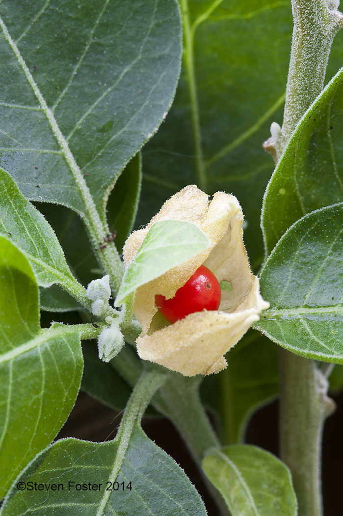 L’Ashwagandha forme un petit buisson compact de 40 à 60 cm de hauteur, aux tiges recouvertes d’un fin duvet grisâtre. Ses feuilles sont ovales, d’un vert mat assez discret.